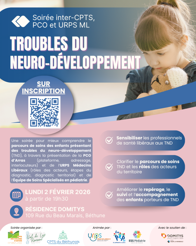 Dans le cadre de l’accompagnement des enfants présentant des troubles du neuro-développement (TND), une soirée inter-CPTS est organisée en partenariat avec la PCO d’Arras et l’URPS Médecins Libéraux des Hauts-de-France.